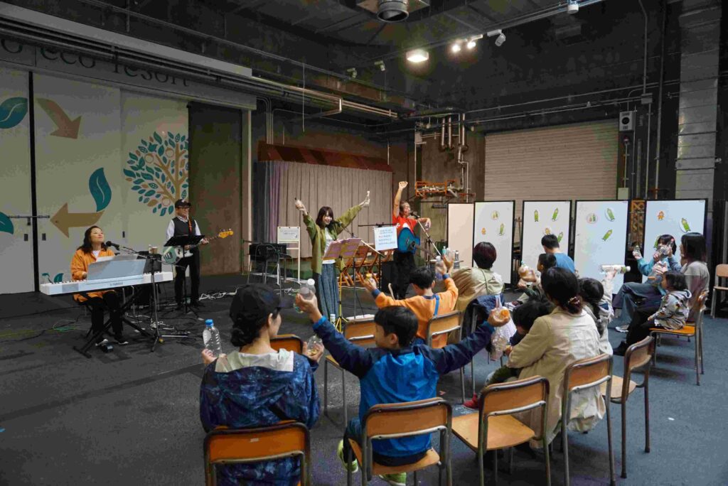 使い終わったペットボトルをリユースしてオリジナルのエコ楽器をつくり、プロの演奏家と一緒にみんなで演奏しました。